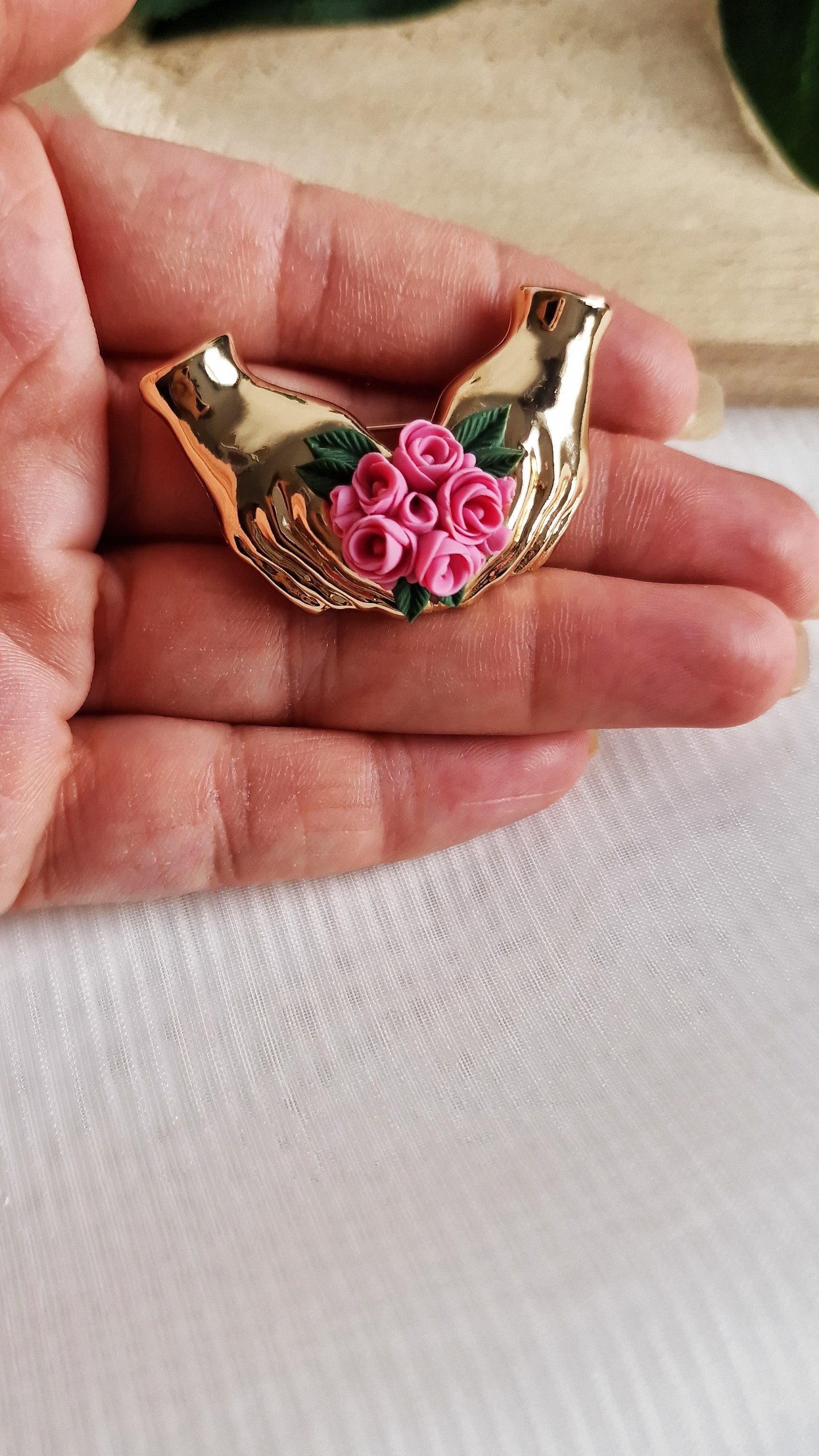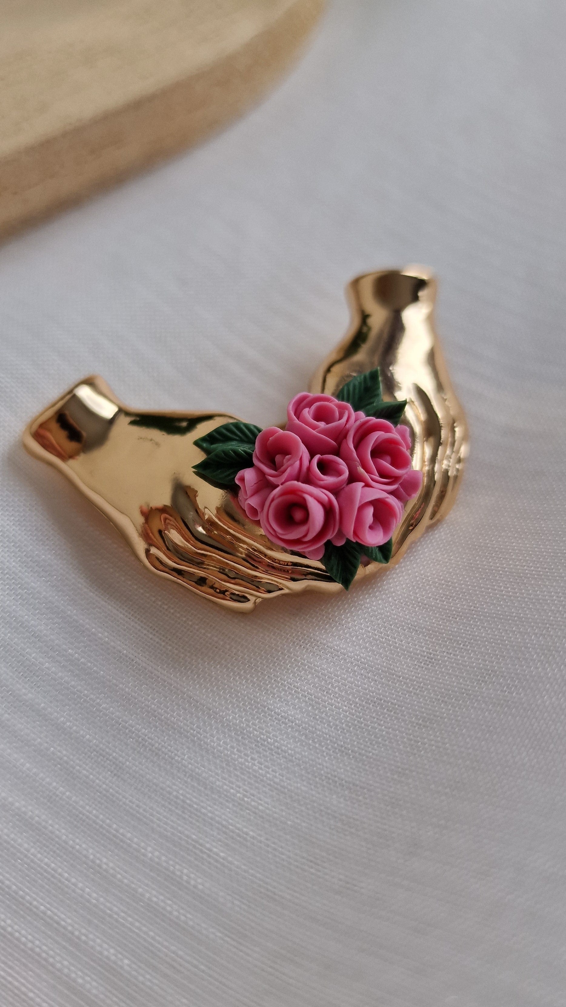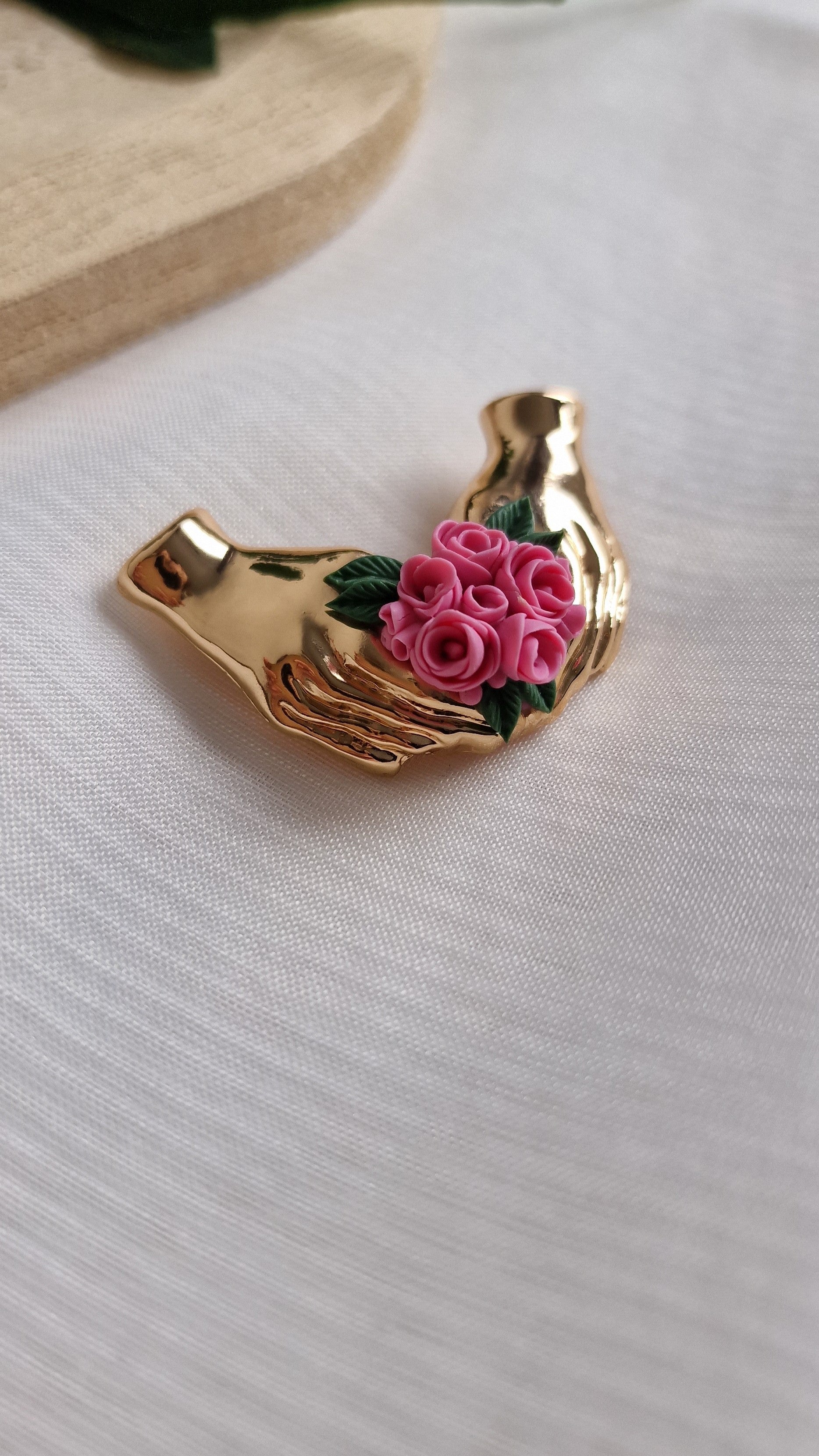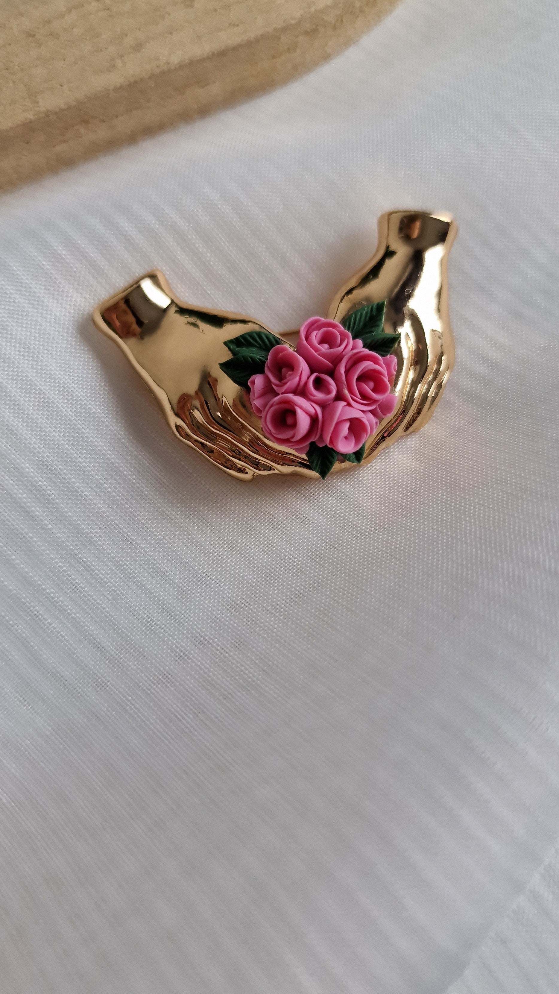 Embrace the elegance of our 'Hands of Love' brooch – a delicate portrayal of affection with pink roses cradled in a heart-shaped embrace. This handcrafted piece is a symbol of romance and tenderness, making it a perfect accessory for moments filled with love.